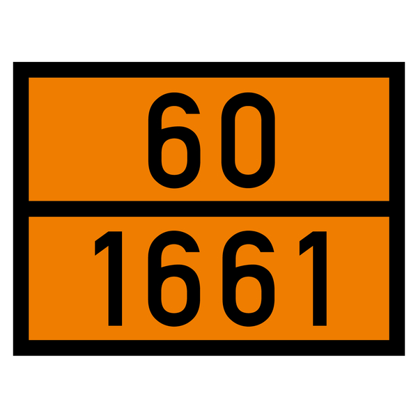 Auf orangefarbenem Untergrund befindet sich oben die Gefahrenzahl 60 und unten die Gefahrstoffnummer 1661. Am Rand und in der Mitte ist eine schwarze Linie aufgedruckt.