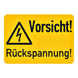 Dieses Hinweisschild "Vorsicht Rückspannung" erhalten Sie als Aufkleber in Größe 105 x 74 mm, aus gelber, selbstklebender Folie. Auf dem Warnschild befindet sich in schwarz der Druck "Vorsicht Rückspannung" und das Warnzeichen "Warnung vor gefährlicher elektrischer Spannung". Der Aufkleber ist an den Ecken abgerundet und wird Ihnen zu 1 Stück angeboten. Mit dieser Kennzeichnung weisen Sie Personen auf elektrische Spannung und der hervorgehenden Gefahr hin.