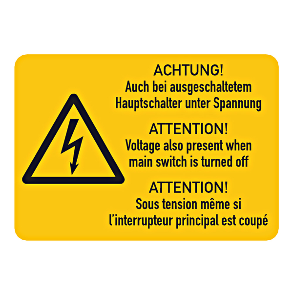 - Text: Achtung! Auch bei ausgeschaltetem Hauptschalter unter Spannung, Attention! Voltage also present when main switch is turned off, Attention! Sous tension même si línterrupteur principal est coupé