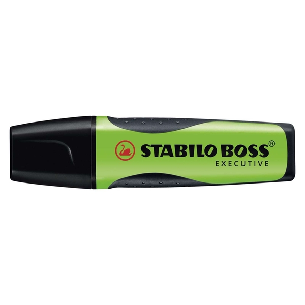 Premium-Textmarker STABILO® BOSS® EXECUTIVE. Inkjet geeignet. Strichstärke: 2 - 5 mm. Art der Schreibflüssigkeit: Tinte auf Wasserbasis, lichtbeständig. Tintenspeicher-Technik: Kapillarspeicher. Einzigartige patentierte Anti-Schmier-Tinte auf Wasserbasis, mit speziellen Pigmenten. Farbe des Schaftes: schwarz mit Schreibfarbe. Farbe: Grün.