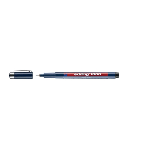 Faserzeichner edding 1800 profipen 0.1. Metallgefasste Kunststoffspitze eignet sich auch für Schablonen. Lichtbeständige, wasserfeste Pigmenttusche auf Wasserbasis. Dunkelblauer Kunststoffschaft und Kappe mit Edelstahlclip. Strichstärke: ca. 0,25 mm. Schreibfarbe: schwarz.