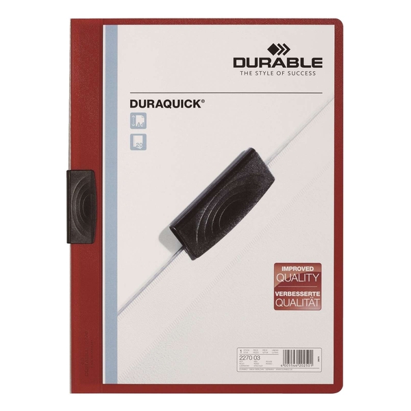 DURABLE Klemm-MappeKlemm-Mappe DURAQUICK®, DIN A4, DIN A4, rot. Klemm-Mappe mit flachem, dauerelastischen Kunststoffclip. Fassungsvermögen: 1–20 Blatt DIN A4