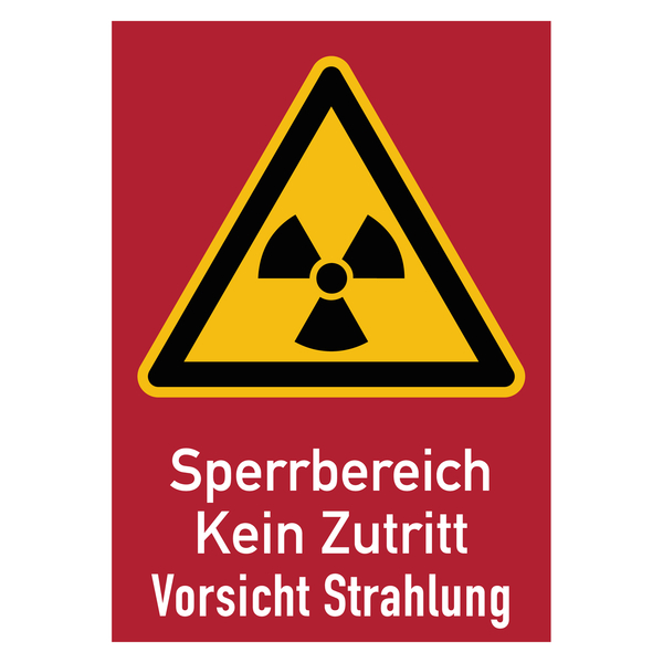 Das Warnzeichen "Sperrbereich Kein Zutritt Vorsicht Strahlung" erhalten Sie hier in verschiedenen Größen und Materialien. Das rote Kombischild beinhaltet das gelbe Zeichen für radioaktive Stoffe und ionisierenden Strahlen sowie den weißen Zusatztext "Sperrbereich Kein Zutritt Vorsicht Strahlung". Die Materialien sind licht- und witterungsbeständig und somit für den Innen- und Außenbereich bestens geeignet. Das Warnschild ist ein Sicherheitszeichen, um vor Gefahren zu warnen, Unfälle zu vermeiden und die Gesundheit zu schützen.