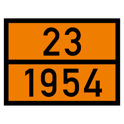 Auf orangefarbenem Untergrund befindet sich oben die Gefahrenzahl 23 und unten die Gefahrstoffnummer 1954. Am Rand und in der Mitte ist eine schwarze Linie aufgedruckt.