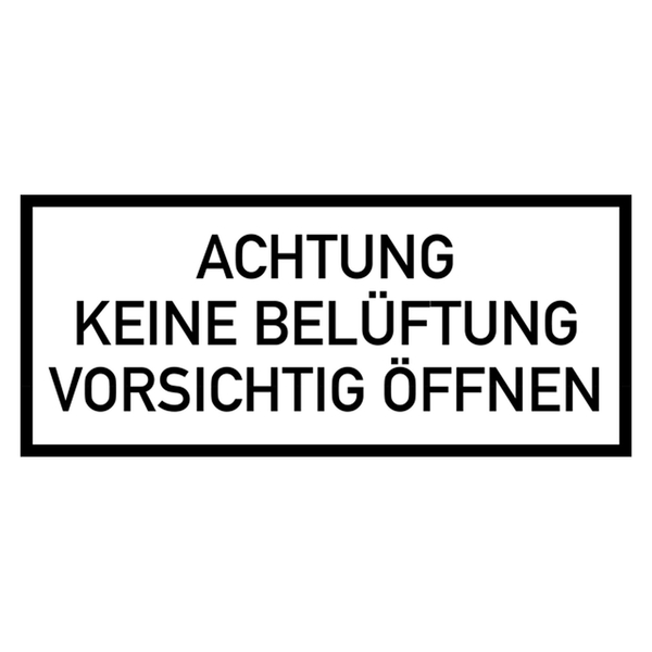 Das Hinweisschild hat eine Größe (B x H) von 350 x 150 mm und besteht aus selbstklebender Folie. Auf weißem Untergrund befindet sich in Schwarz der Text: ACHTUG KEINE BELÜFTUNG VORSICHTIG ÖFFNEN. Am Rand ist das Schild mit einem breiten schwarzen Rand versehen.