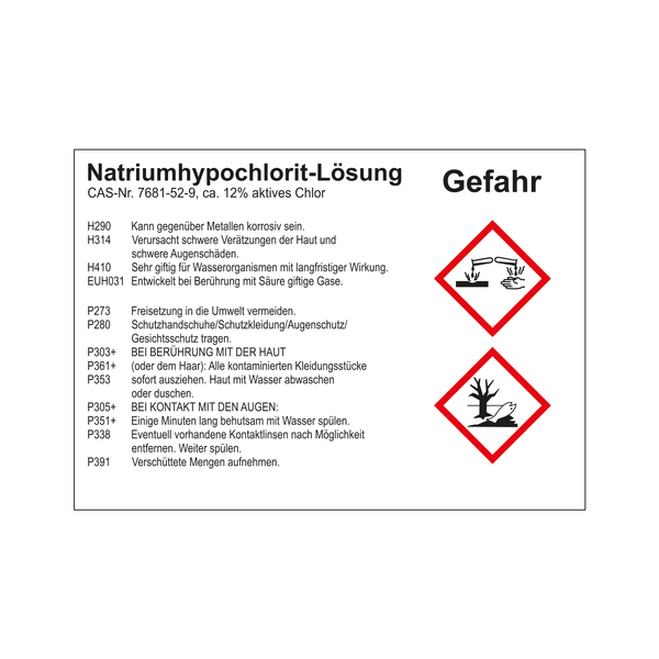 Auf weißem Untergrund ist oben links der Gefahrenstoff Natriumhypochlorit-Lösung und die CAS-Nr. 7681-52-9, ca. 12% aktives Chlor aufgedruckt. Darunter befinden sich die H- und P-Sätze. Die Gefahrenpiktogramme GHS05 Ätzwirkung, GHS09 Umwelt sind auf der rechten Seite aufgedruckt. Darüber befindet sich das Signalwort Gefahr.