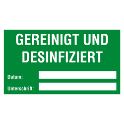 Auf grünem Untergrund ist oben der Text Gereinigt und Desinfiziert in der Farbe Weiß aufgedruckt. Darunter befinden sich zwei Textfelder zum Selbstbeschriften für das Datum und die Unterschrift.
