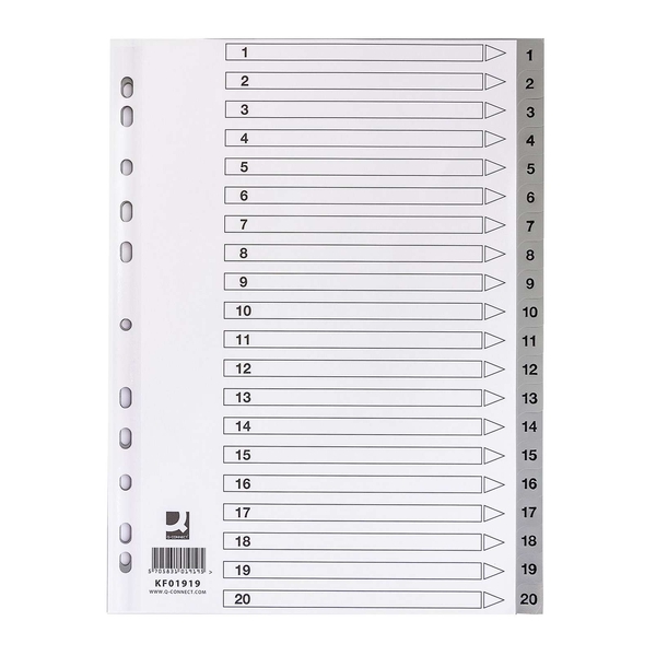 Q-CONNECT Zahlenregister - 1 - 20, PP, A4, 20 Blatt + Indexblatt, grau