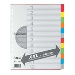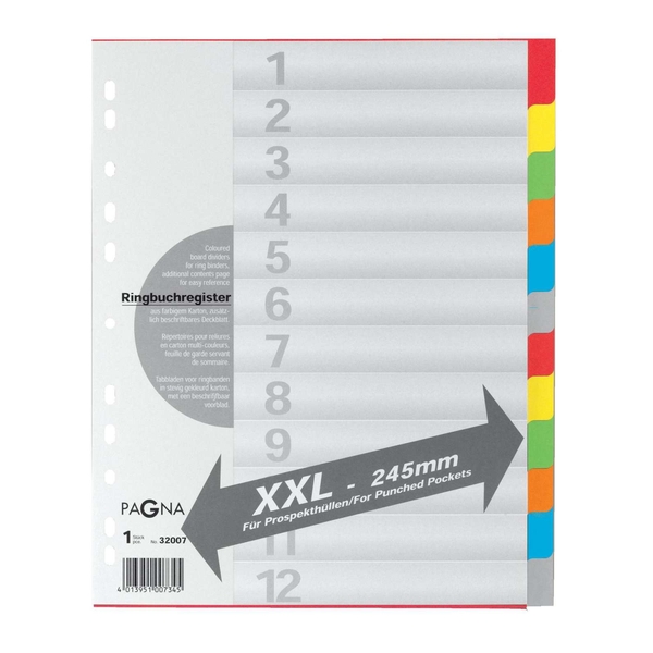 Register XXL zur Ablage von Prospekthüllen für Dokumente im Format A4. 12-teilig. 6-farbig für schnellen Zugriff aus stabilem Karton (RC) mit praktischer Universallochung. Beschriftbarem Deckblatt für übersichtliche Ablage. Maße (B x H x T): 245 x 300 x 3 cm, Karton 225 g/qm.