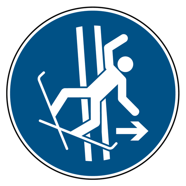 Auf dem Gebotsschild befindet sich auf blauem Untergrund das Piktogramm Im Fall eines Sturzes Schleppspur sofort verlassen. Das Gebotzeichen eignet sich für die Kennzeichnung von gestatteten Handlungen oder Tätigkeiten. Die Gebotsschilder weisen darauf hin, dass die Schleppspur im Falle eines Sturzes sofort werden sollte.