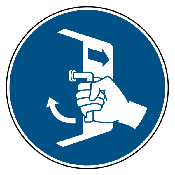 Auf dem Gebotsschild befindet sich auf blauem Untergrund das Piktogramm Öffnungen schließen und sichern beim Aussetzvorgang. Das Gebotzeichen eignet sich für die Kennzeichnung von gestatteten Handlungen oder Tätigkeiten. Die Gebotsschilder weisen darauf hin, dass beim Aussetzvorgang alle Öffnungen geschlossen und gesichert sein müssen.