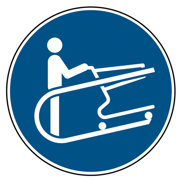 Auf dem Gebotsschild befindet sich auf blauem Untergrund das Piktogramm Griff des Wagens festhalten. Das Gebotzeichen eignet sich für die Kennzeichnung von gestatteten Handlungen oder Tätigkeiten. Die Gebotsschilder weisen darauf hin, dass der Griff des Einkaufswagens festgehalten werden soll.