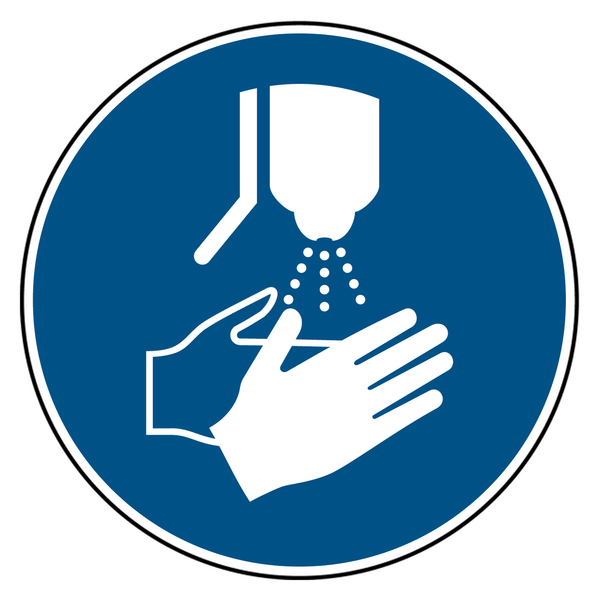 Auf dem Gebotsschild befindet sich auf blauem Untergrund das Piktogramm Hände desinfizieren. Das Gebotzeichen eignet sich für die Kennzeichnung von gestatteten Handlungen oder Tätigkeiten. Die Gebotsschilder weisen darauf hin, dass vor dem Betreten bestimmter Bereiche oder vor bestimmten Tätigkeiten die Hände desinfiziert werden sollen.