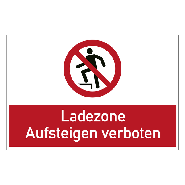 Auf dem Verbotszeichen befindet sich auf weißem Untergrund oben das Piktogramm Aufsteigen verboten nach DIN EN ISO 7010 und darunter auf rotem Untergrund der Text Ladezone Aufsteigen verboten. Das Verbotsschild eignet sich für die Kennzeichnung von nicht gestatteten Handlungen oder Tätigkeiten. Die Bodenschilder weisen darauf hin, dass in der Ladezone das Hinaufsteigen verboten ist.