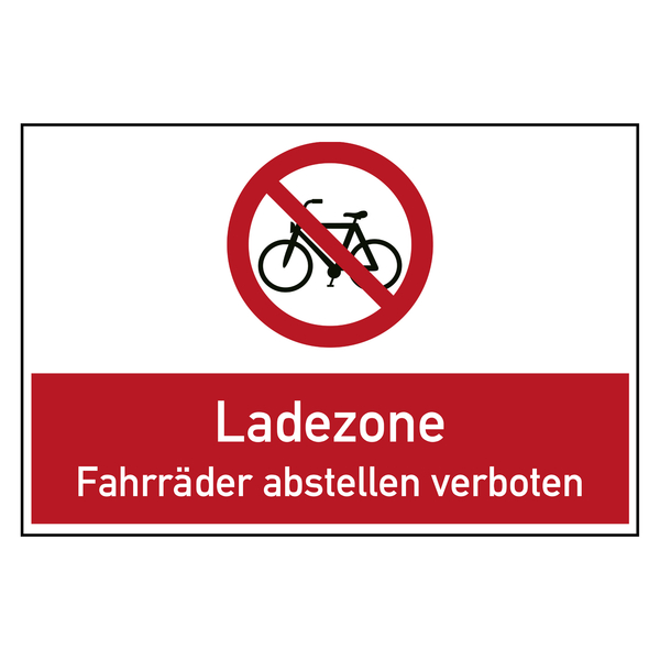 Auf dem Verbotszeichen befindet sich auf weißem Untergrund oben das Piktogramm Fahrräder abstellen verboten und darunter auf rotem Untergrund der Text Ladezone Fahrräder abstellen verboten. Das Verbotsschild eignet sich für die Kennzeichnung von nicht gestatteten Handlungen oder Tätigkeiten. Die Bodenschilder weisen darauf hin, dass in der Ladezone das Abstellen von Fahrrädern verboten ist.