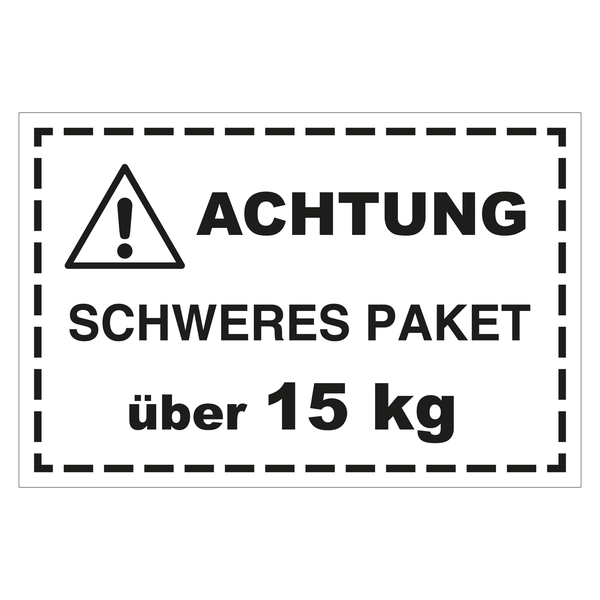 Auf weißem Untergrund ist der Text Achtung Schweres Paket über 15 kg in der Farbe Schwarz aufgedruckt. Am Rand befindet sich ein schwarzer gestrichelter Rahmen und eine weiße Lichtkante.