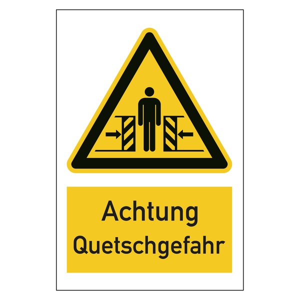 Das Warnzeichen Achtung Quetschgefahr ist in verschiedenen Größen und Materialien erhältlich.