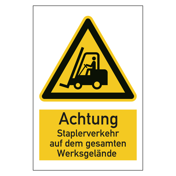 Auf dem Warnschild befindet sich oben das Piktogramm Warnung vor Flurförderzeugen nach DIN EN ISO 7010. Darunter ist der Text Achtung Staplerverkehr auf dem gesamten Werksgelände aufgedruckt. Die Warnschilder eignen sich für die Kennzeichnung von Hindernissen und Gefahrstellen, an denen es zu Risiken oder Gefährdungen kommen kann. Die Warnzeichen weisen darauf hin, dass an der gekennzeichneten Stelle eine Gefahr durch Flurförderzeuge auf dem gesamten Betriebsgelände besteht.