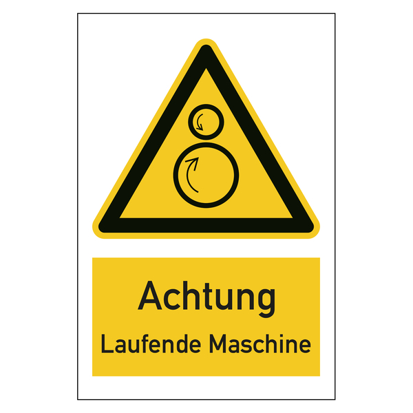 Das Warnzeichen Achtung Laufende Maschine ist in verschiedenen Größen und Materialien erhältlich.