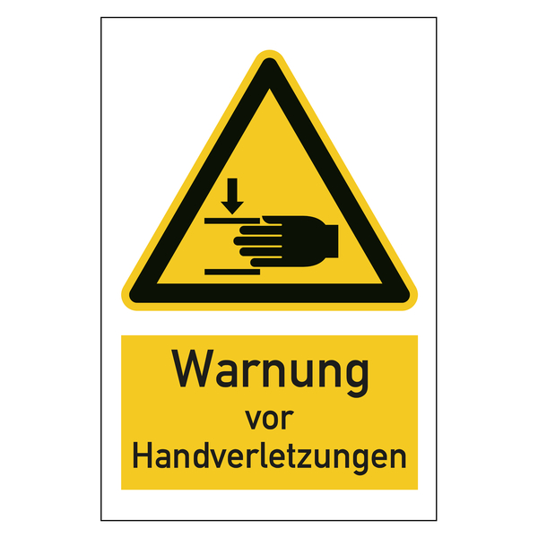 Das Warnzeichen Warnung vor Handverletzungen ist in verschiedenen Größen und Materialien erhältlich.