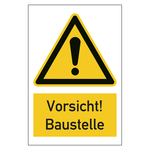 Auf dem Warnschild befindet sich oben das Piktogramm Allgemeines Warnzeichen nach DIN EN ISO 7010. Darunter ist der Text Vorsicht Baustelle aufgedruckt. Die Warnschilder eignen sich für die Kennzeichnung von Hindernissen und Gefahrstellen, an denen es zu Risiken oder Gefährdungen kommen kann. Die Warnzeichen weisen darauf hin, dass an der gekennzeichneten Stelle eine Gefahr durch eine Baustelle besteht.