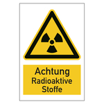Auf dem Warnschild befindet sich oben das Piktogramm Warnung vor radioaktiven Stoffen oder ionisierender Strahlung nach DIN EN ISO 7010. Darunter ist der Text Achtung Radioaktive Stoffe aufgedruckt. Die Warnschilder eignen sich für die Kennzeichnung von Hindernissen und Gefahrstellen, an denen es zu Risiken oder Gefährdungen kommen kann. Die Warnzeichen weisen darauf hin, dass an der gekennzeichneten Stelle eine Gefahr durch radioaktive Stoffe besteht.