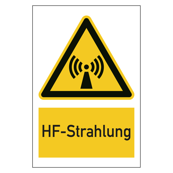 Auf dem Warnschild befindet sich oben das Piktogramm Warnung vor nicht ionisierender Strahlung nach DIN EN ISO 7010. Darunter ist der Text HF-Strahlung aufgedruckt. Die Warnschilder eignen sich für die Kennzeichnung von Hindernissen und Gefahrstellen, an denen es zu Risiken oder Gefährdungen kommen kann. Die Warnzeichen weisen darauf hin, dass an der gekennzeichneten Stelle eine Gefahr durch Hochfrequenz-Elektromagnetische Felder besteht.