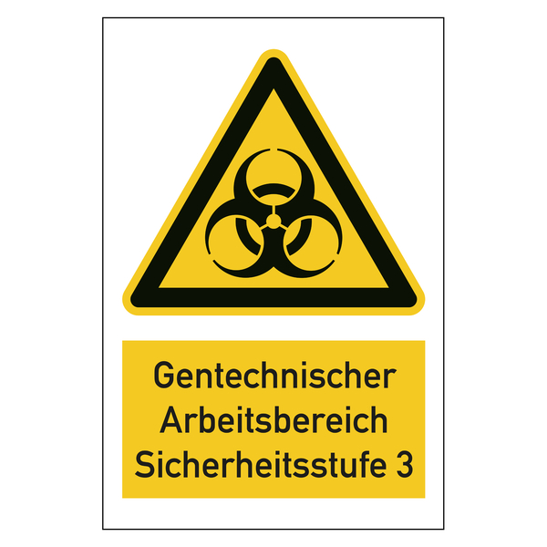 Auf dem Warnschild befindet sich oben das Piktogramm Warnung vor Biogefährdung nach DIN EN ISO 7010. Darunter ist der Text Gentechnischer Arbeitsbereich Sicherheitsstufe 3 aufgedruckt. Die Warnschilder eignen sich für die Kennzeichnung von Hindernissen und Gefahrstellen, an denen es zu Risiken oder Gefährdungen kommen kann. Die Warnzeichen weisen darauf hin, dass an der gekennzeichneten Stelle eine Gefahr durch Freisetzung von Toxinen oder krankheitsauslösenden Mikroorganismen besteht.