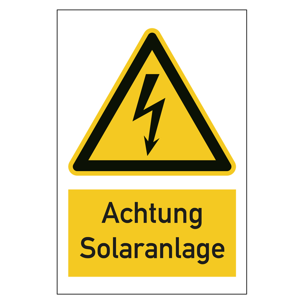 Auf dem Warnschild befindet sich oben das Piktogramm Warnung vor elektrischer Spannung nach DIN EN ISO 7010. Darunter ist der Text Achtung Solaranlage aufgedruckt. Die Warnschilder eignen sich für die Kennzeichnung von Hindernissen und Gefahrstellen, an denen es zu Risiken oder Gefährdungen kommen kann. Die Warnzeichen weisen darauf hin, dass an der gekennzeichneten Stelle eine Gefahr durch elektrische Spannung an einer Photovoltaikanlage besteht.