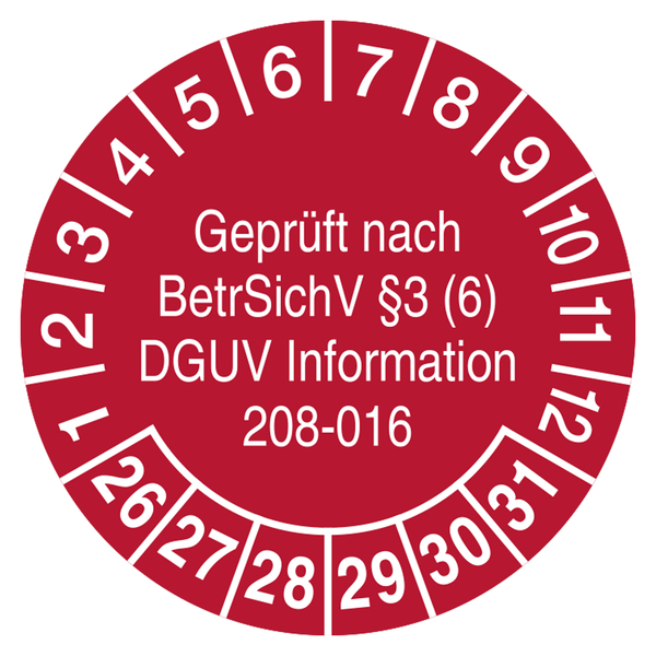 In der Mitte der Plaketten ist der Text Geprüft nach BetrSichV §3 (6) DGUV Information 208-016 in der Farbe Weiß aufgedruckt. Die Monatszahlen von 1 - 12 und die Jahreszahlen mit einer Prüfspanne von 6 Jahren befinden sich am Rand. Die Prüfaufkleber haben unterschiedliche Hafteigenschaften.