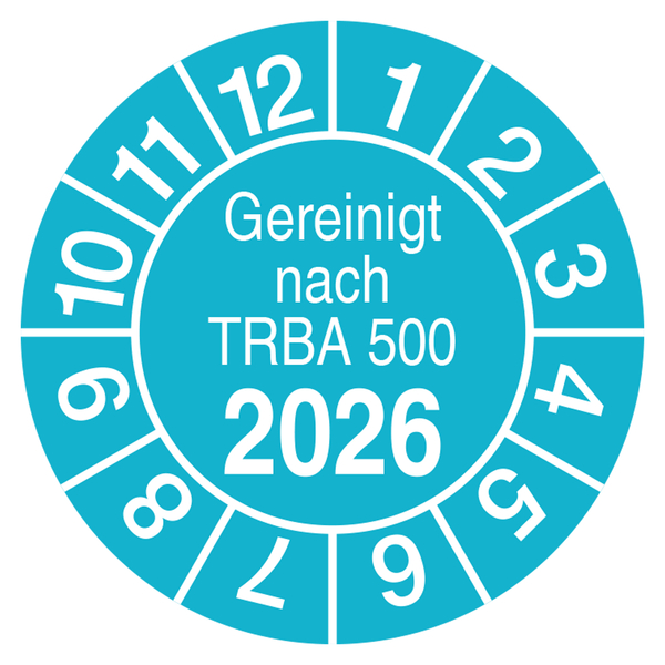 In der Mitte der Plaketten ist der Text Gereinigt nach TRBA 500 und die Jahreszahl in der Farbe Weiß aufgedruckt. Die Monatszahlen von 1 - 12 befinden sich am Rand. Je nach Materialauswahl verfügen die Prüfaufkleber über unterschiedliche Hafteigenschaften, z. B. permanent haftend oder wiederablösbar.