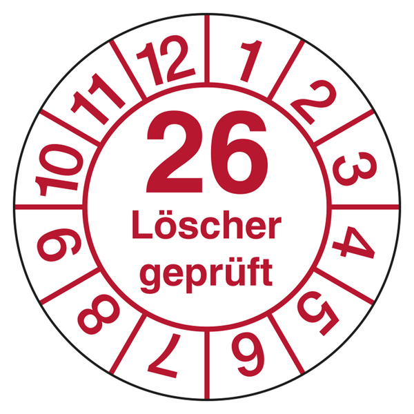 In der Mitte der Plaketten sind der Text Löscher geprüft und die Jahreszahlen in der Farbe Rot aufgedruckt. Die Monatszahlen von 1 - 12 befinden sich am Rand. Je nach Materialauswahl verfügen die Prüfaufkleber über unterschiedliche Hafteigenschaften, z. B. permanent haftend oder wiederablösbar.