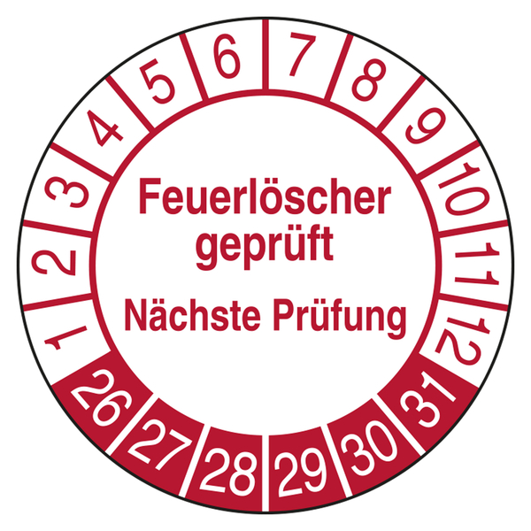In der Mitte der Plaketten ist der Text Feuerlöscher geprüft Nächste Prüfung in der Farbe Rot aufgedruckt. Die Monatszahlen von 1 - 12 und die Jahreszahlen mit einer Prüfspanne von 6 Jahren befinden sich am Rand. Je nach Materialauswahl verfügen die Prüfaufkleber über unterschiedliche Hafteigenschaften, z. B. permanent haftend oder wiederablösbar.
