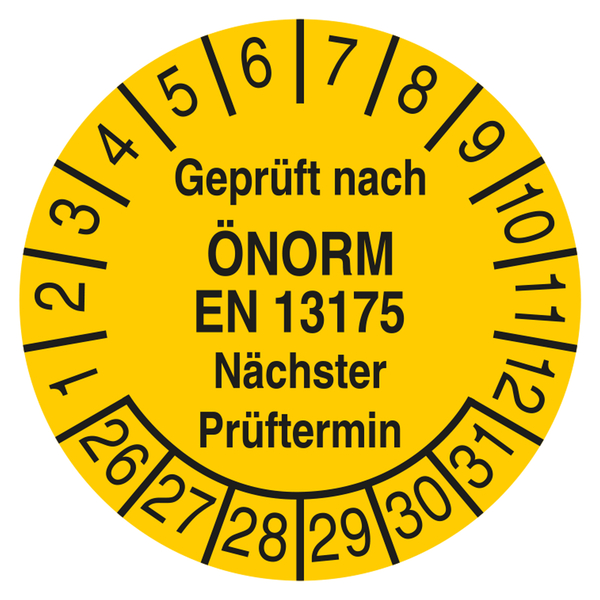 Prüfplakette Geprüft nach ÖNORM EN 13175 Nächster Prüftermin Gelb