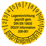 Prüfplakette Lagereinrichtung geprüft gem. DIN EN 15635 DGUV Information 208-061 Gelb