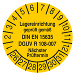 Prüfplakette Lagereinrichtung geprüft gemäß DIN EN 15635 DGUV 108-007 Nächster Prüftermin Gelb