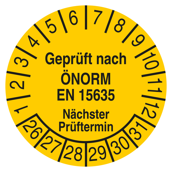 Prüfplakette Geprüft nach ÖNORM EN 15635 Nächster Prüftermin Gelb